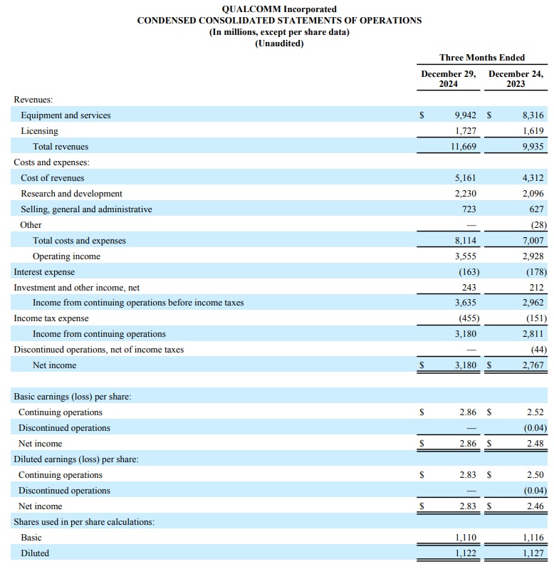 高通(Qualcomm Inc.)於美國股市週三(2 月 5 日)盤後公布 2025 會計年度第 1 季(截至 2024 年 12 月 29 日為止)財報:營收年增 17% 至史上最高的 116.69 億美元,非一般公認會計原則(Non-GAAP)每股稀釋盈餘年增 24% 至 3.41 美元、創歷史新高。