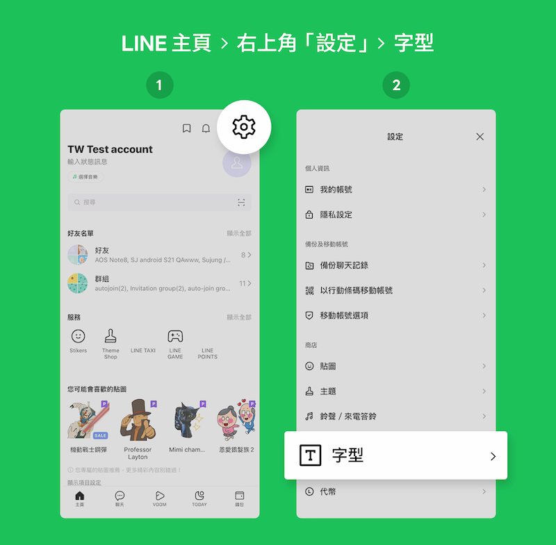 透過 3 步驟可將 LINE 行動版套用「芫荽」字型:在 LINE 主頁點選右上角齒輪符號的【設定】→ 點選【字型】→ 最後選擇「芫荽」(同理可以換回手機預設字型)即可。