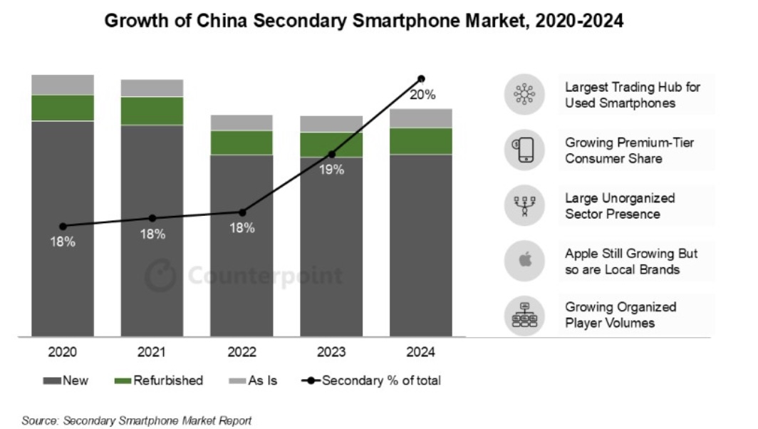 有越來越多人在選購智慧手機時,會將二手品納入考量。調研機構 Counterpoint Research 最新《全球二手智慧手機市場報告》,中國二手智慧手機市場(含整新機+全新機)佔中國整體(新機+二手機)智慧手機市場 20%,展現市場快速成長。
