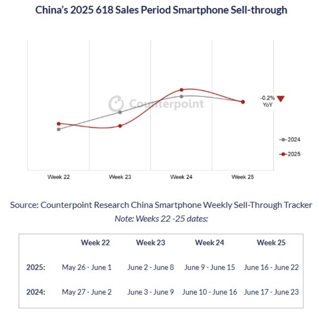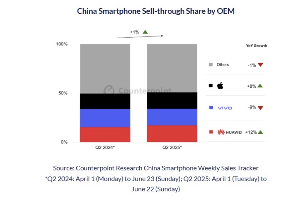 據調研機構 Counterpoint Research 最新《中國智慧型手機每週銷量追蹤報告》初步數據顯示,2025 年第二季中國智慧型手機銷量預計將較去年同期小幅成長,成長動能主要來自華為與蘋果等品牌。
