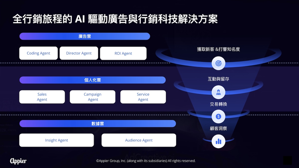 Appier 8 款 AI Agent 橫跨三大產品線,包括廣告雲的「ROI Agent」、「Director Agent」、「Coding Agent」,個人化雲的「Sales Agent」、「Service Agent」、「Campaign Agent」,數據雲的「Audience Agent」、「Insight Agent」。這些 AI Agent 內建產業專家級智慧,依據品牌專屬知識建立預測模型,將數據轉化為可預測的營收或回報,配合全年無休自主學習,可達成大規模、個人化的預測式互動。