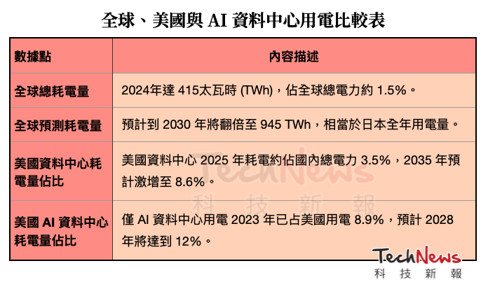 資料中心是現代數位經濟的基石,負責處理和儲存大量數據。根據國際能源總署(IEA)2025年報告,全球資料中心2024年耗電量已達415太瓦時(TWh),約占全球總電力1.5%,預計到2030年將翻倍至945 TWh,相當於日本全年用電量。美國資料中心2025年耗電約占國內總電力3.5%,2035年預計激增至8.6%。僅AI資料中心用電2023年已占美國用電8.9%,預計2028年將達到12%。這使得資料中心成為能源消耗的主要來源之一。
