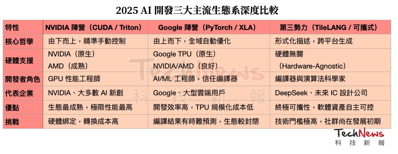 2025 年這個 AI 技術爆炸的時代,決定霸權歸屬的戰場,已從矽晶片的物理極限,全面轉移到其上的軟體生態系。當 NVIDIA 的 CUDA 帝國以其深不見底的護城河鞏固江山,Google 以 TPU 與 XLA 編譯器建立起高效的垂直聯邦時,一股「第三勢力」正悄然崛起。以 DeepSeek 為首的頂尖 AI 公司,開始將賭注押在如 TileLANG 這樣的新一代「可攜式性能語言」上,試圖從根本上瓦解硬體綁定的舊秩序。這場三方角力,不僅重新定義了 AI 開發的典範,更將深刻影響從雲端巨頭到台灣半導體產業的未來命運。