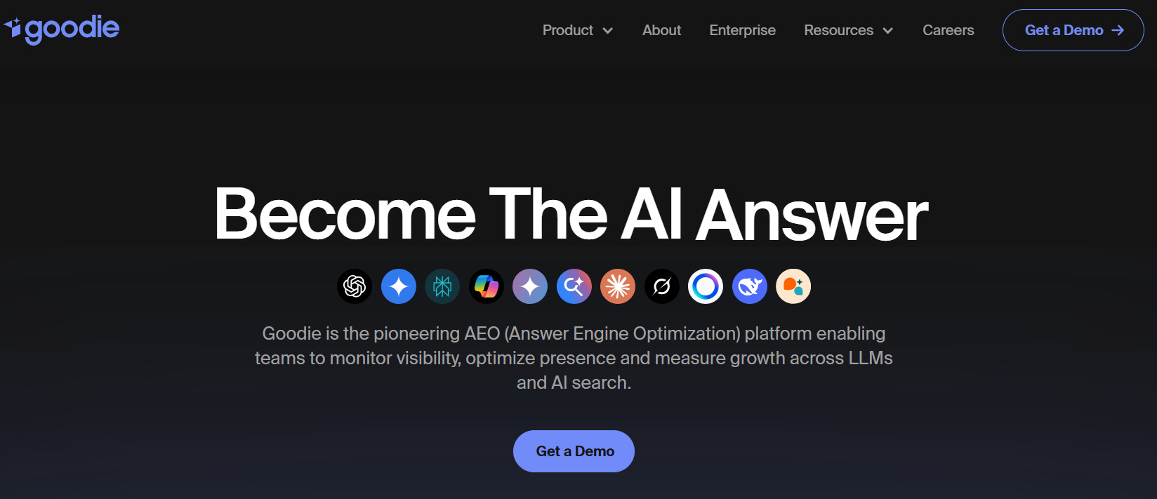 並非所有公司都像Profound和AthenaHQ一樣,從一開始就建立複雜的分析平台。2023年成立於紐約的Goodie AI,選擇了一條不同的路,他們不追求技術的複雜性,而是把GEO包裝成更容易理解的「AEO」(Answer Engine Optimization,答案引擎最佳化) 。