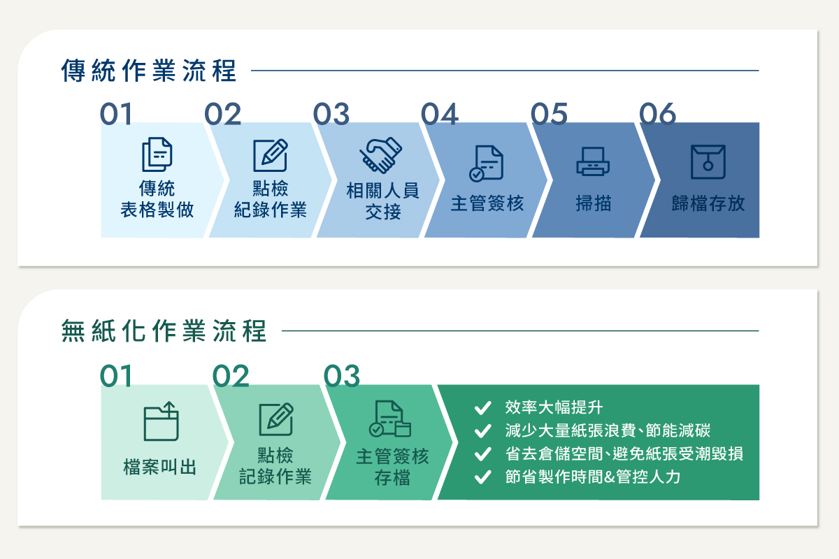 許多工廠雖已引進自動化設備取代人力,但在記錄與審核過程中仍普遍依賴紙本作業。從日常點檢表到檢驗紀錄,每月耗費上千張紙,不僅造成資源浪費,還需投入人力進行複印、整理與歸檔,更得額外規劃倉儲空間,否則容易面臨受潮、毀損或遺失等風險。更進一步來看,紙本流程的低效率不僅隱藏在耗材與保存成本中,也反映在日常運作上。文件調閱與比對往往耗時,人工處理更易出錯,讓後續數據分析失去即時性與準確性。換言之,紙張紀錄已成為工廠自動化與數位化之間的一大斷層,也是拖慢效能的隱形障礙。