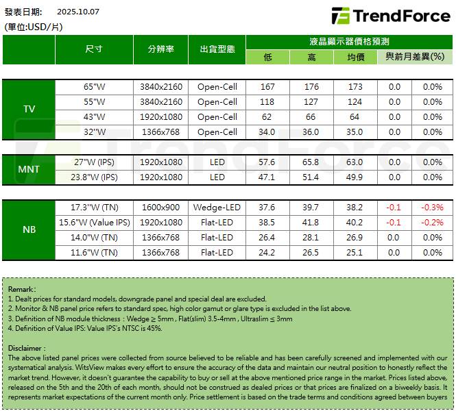 ▲ TrendForce 10 月上旬面板價格預測。(Source:TrendForce)