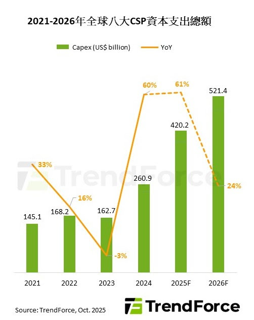 TrendForce表示,2026年在GB/VR等AI機櫃方案持續放量下,八大CSP的總資本支出有望再創新高,年增達24%,來到5,200億美元以上。除此之外,支出結構已從能直接創造收益的設備,轉向server、GPU等短期資產,意味著鞏固中長期競爭力與市占率優先於改善短期獲利。