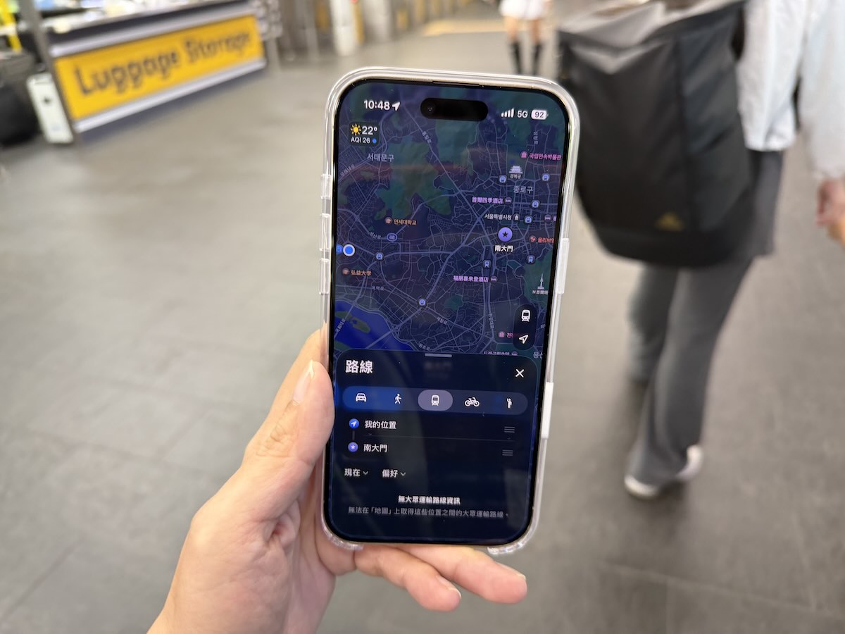旅行時最怕迷路。背包客可透過 iPhone Air 使用內建的「蘋果地圖」或下載「Google 地圖」查找景點與路線。不過要特別注意,像韓國這類國家出於法規原因,不開放外國地圖 App 的導航功能,但仍能顯示地點與大致方位,足以幫助旅客掌握方向。