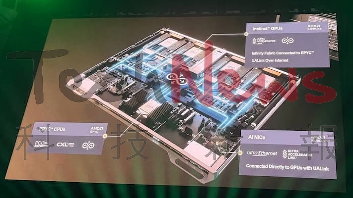 Papermaster 表示,如果抽出其中一個模組單位,可看到裡頭有許多的開放標準,如 EPYC CPU 透過 PCIe 6.0 連接周邊設備;CXL 擴充介面;透過 Infinity Fabric 實現 CPU 與 GPU 間的直連傳輸;GPU 之間使用 UA Link 連接;Scale-Up 透過 UA Link over Ethernet 實現;管理模組採用 DC-SCM(硬體系統模組化的一部分)。