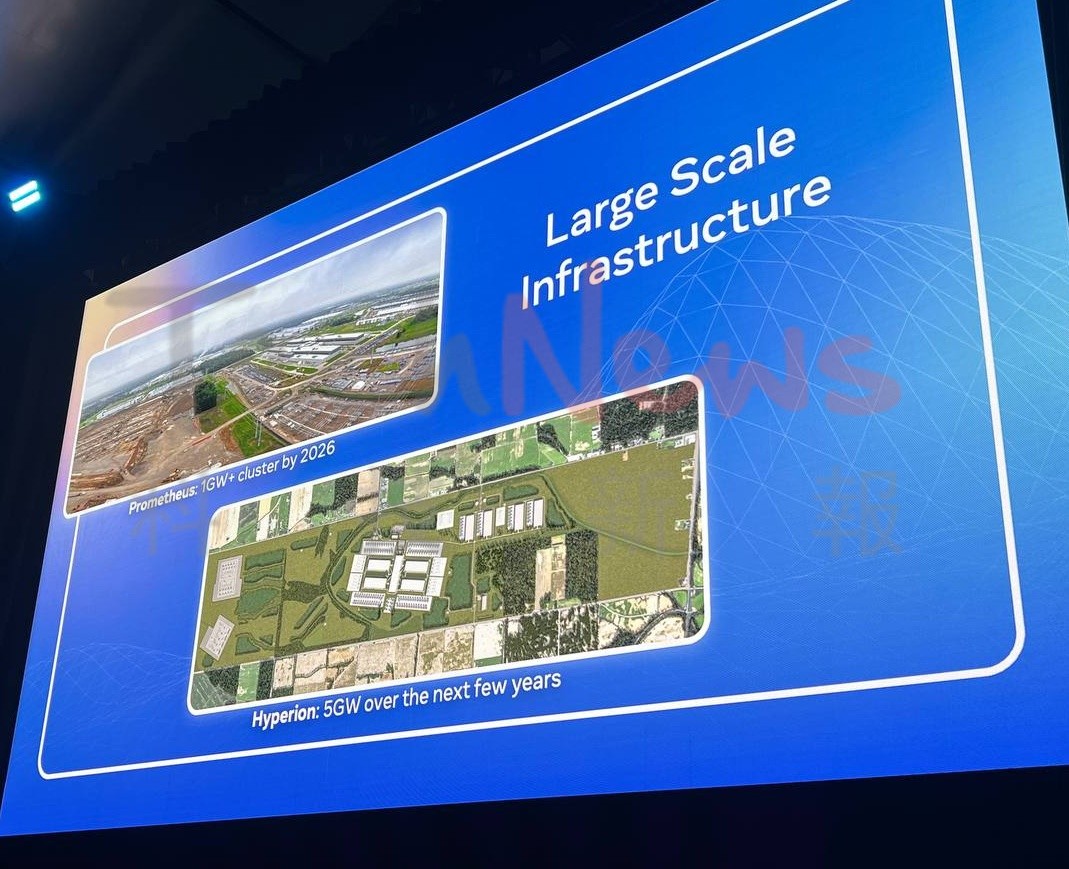 目前 Meta 正同步建設兩座超大型資料中心:位於俄亥俄州 New Albany 的 Prometheus 叢集已正式投入運作,總功率超過 1 GW;另一座位於路易斯安那州 Richland Parish 的 Hyperion 中心則規模達 5 GW,為全球最大單一 AI 資料中心之一。