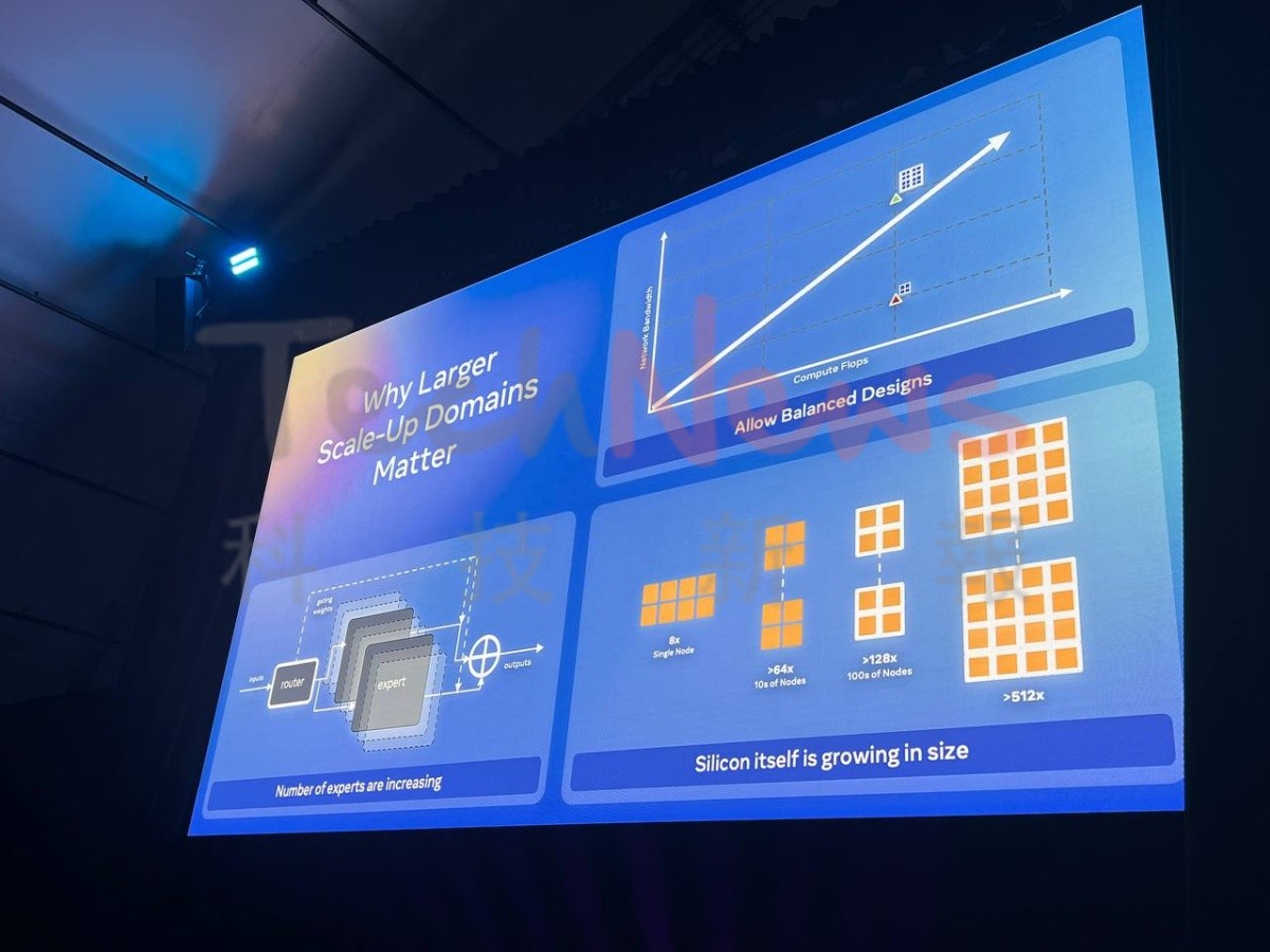 其中,Scale-Up 對 AI 效能愈發關鍵。Rabinovitsj 解釋,隨著晶片的運算密度與 FLOPS 急遽提升,若無法同時擴大網路與記憶體頻寬,就無法充分發揮運算能力;而 更大的 Scale-Up 網域 正能在同一高速互連環境中平衡這三者的性能。