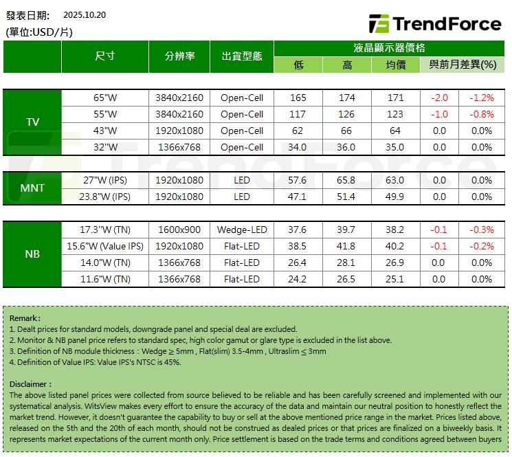 ▲ TrendForce 10 月下旬最新面板報價。(Source:TrendForce)
