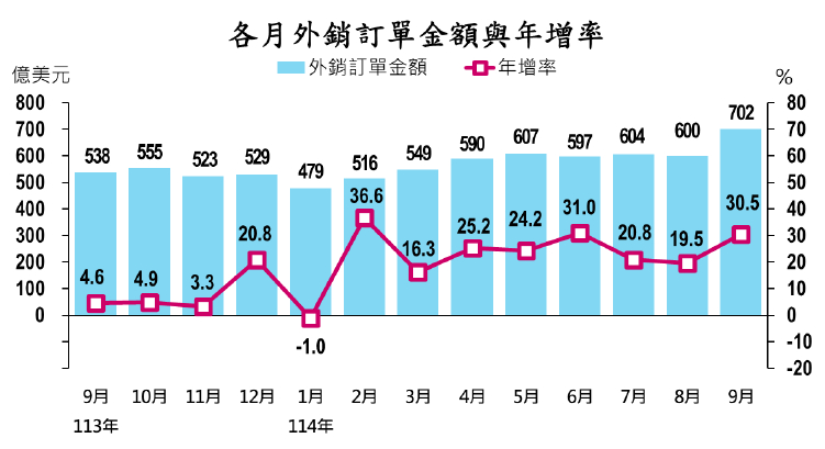 經濟部今天公布 9 月外銷訂單 702.2 億美元,締造歷年單月新高紀錄,連 8 紅。統計處預估,AI 趨勢之下,第四季成長動能持續,全年外銷訂單金額有望創下歷史新高,變數則在美國 232 條款結果。