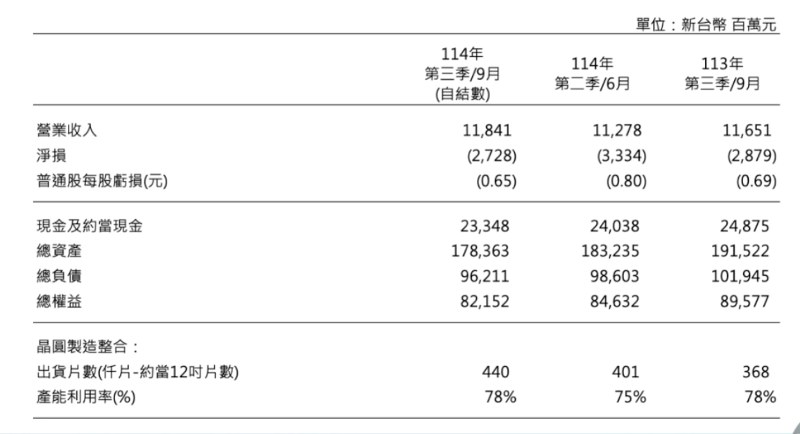 力積電第三季營收為 118.41 億元、季增 5%;每股虧損 0.65 元、較上季微幅縮減;產能利用率則從第二季的 75% 提升至 78%。