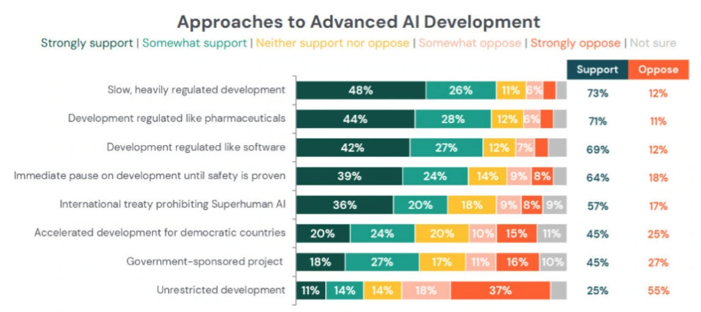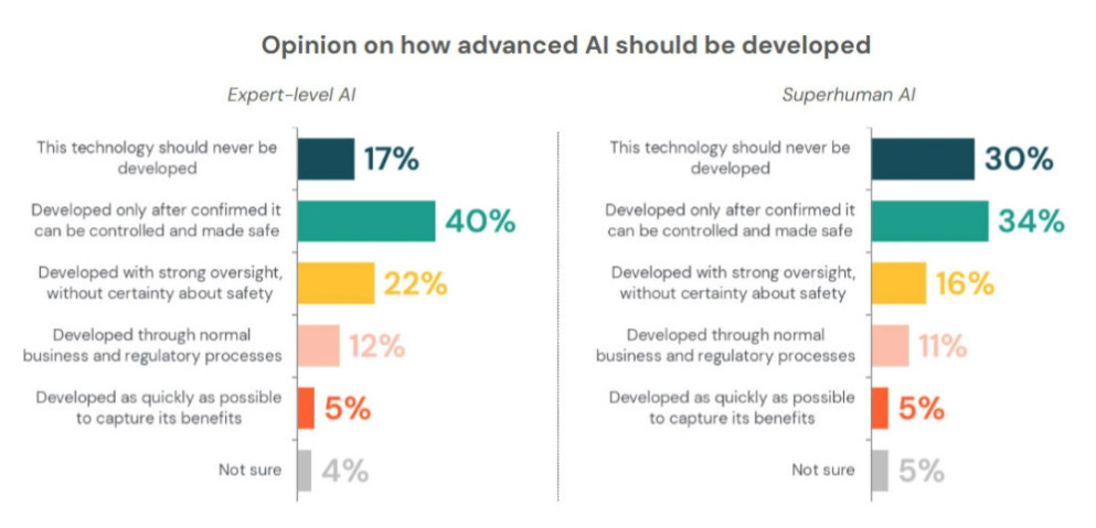 根據FLI的最新調查,約70%的美國民眾支持對AI進行嚴格監管,並認為在技術安全不可確定前,應禁止超智慧AI的研發。FLI執行長Anthony Aguirre提醒,若無社會廣泛覺醒,超智慧AI的開發可能在未來1至2年內實現,風險迫在眉睫。