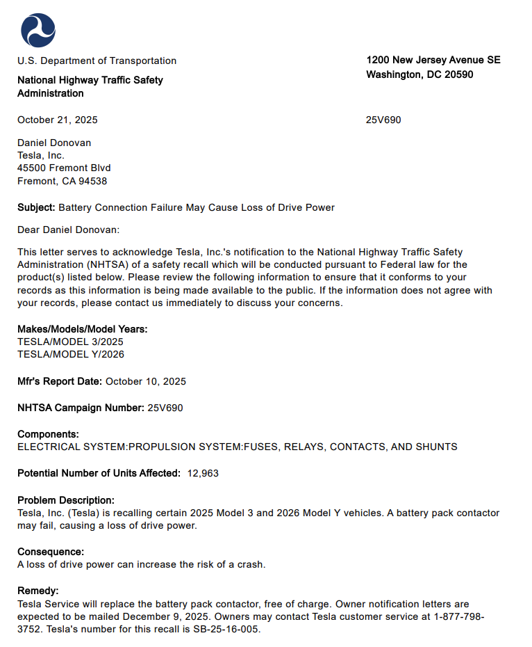 ▲ NHTSA 發布的召回通報原文。(Source:NHTSA)