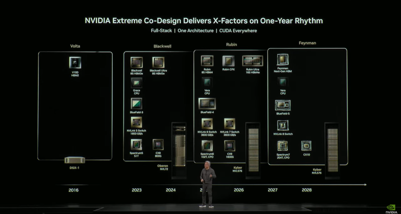輝達還計畫在 2027 年下半年 推出更高階的 Rubin Ultra NVL576 平台。該系統將 NVL 規模從 144 擴展至 576,CPU 架構保持不變,而 GPU 將升級為四顆 Reticle 尺寸核心,性能最高達 100 PFLOPS 的 FP4 精度算力,並搭載 1 TB HBM4e 高頻寬記憶體。