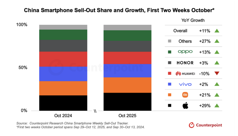 據調研機構 Counterpoint Research 最新《中國智慧型手機週度銷售追蹤》報告顯示,中國智慧手機市場於 2025 年第四季開局表現穩健。統計指出,10 月前兩週(9 月 29 日至 10 月 12 日)整體銷售量年增 11%,主要成長動能來自蘋果與小米兩大品牌。