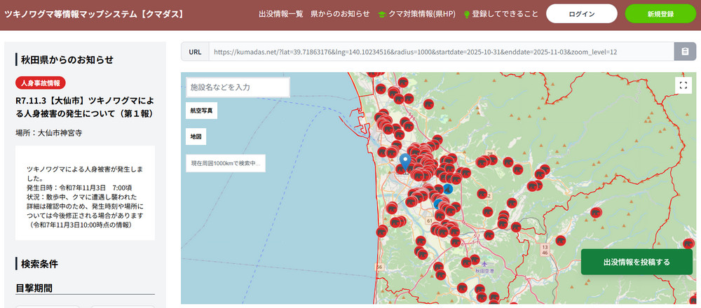 日本近來熊出沒事件大幅增加,由秋田縣政府開發、可查詢秋田縣熊出沒資訊的「Kumadas(クマダス)」系統在 10 月新增超過 5,000 人註冊,使用人數急速增加。