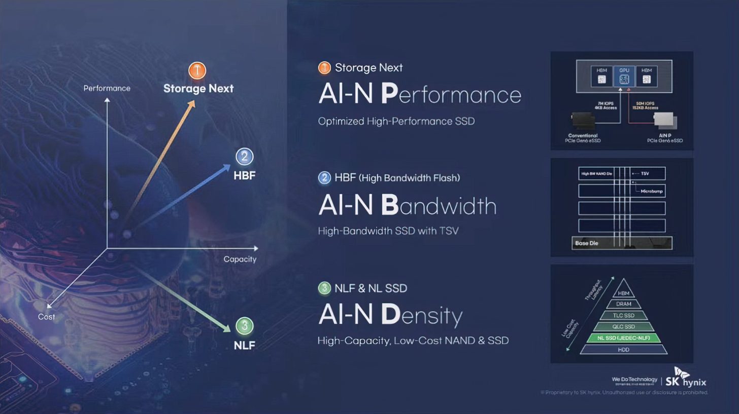 除了 DRAM 之外,在 AI NAND (AI-N) 方面 SK 海力士也正在準備三種下一代儲存解決方案。