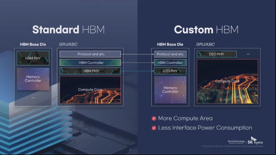 在客製化 HBM (Custom HBM),SK 海力士強調,AI 市場正在從商品化擴展到推論效率和優化。因此,HBM 也從傳統產品演變為客製化產品。客製化 HBM 是將 GPU 和 ASIC 的特定功能整合到 HBM 基座上的產品,以反映客戶需求。這項技術能夠最大化 GPU 和 ASIC 的性能,同時透過 HBM 減少數據傳輸功耗,進而顯著提高系統效率。