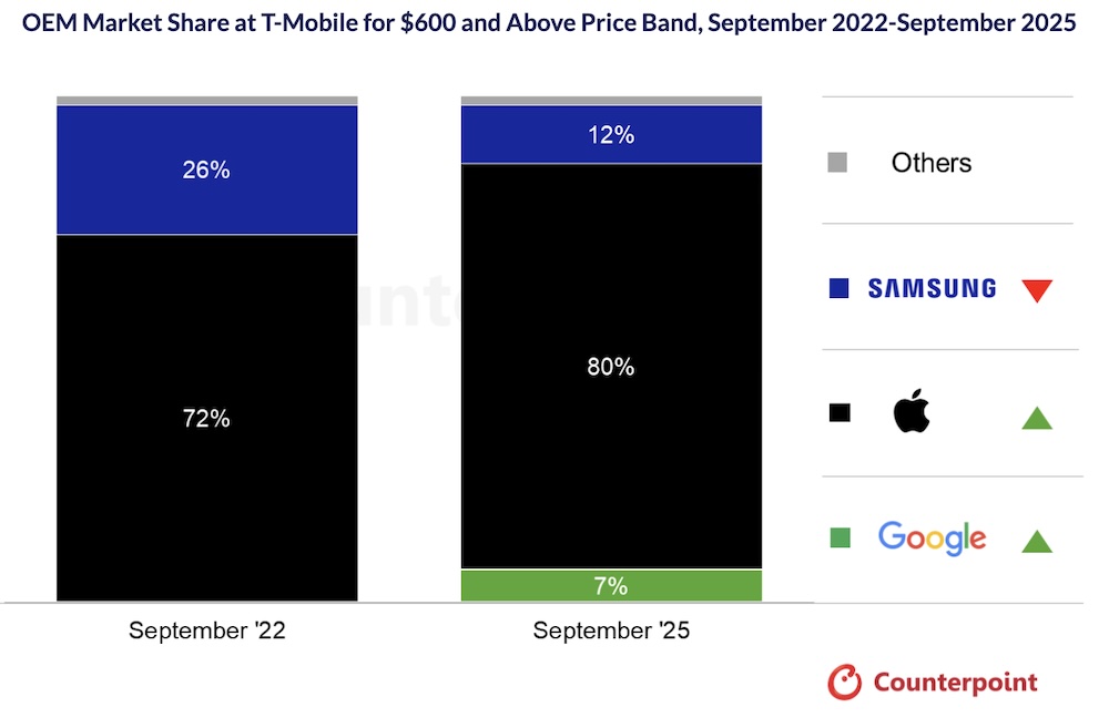 在電信通路方面,Google 近三年於美國三大電信商的表現明顯提升。T-Mobile 與 Verizon 的高階手機市佔率成長最為突出:T-Mobile 自 2022 年的 0.1% 提升至 2025 年的 6.5%,Verizon 則從 0.1% 攀升至 7.0%。相較之下,AT&T 的增長幅度較緩,Google 在該通路的高階手機市佔率目前仍僅有 2.3%。