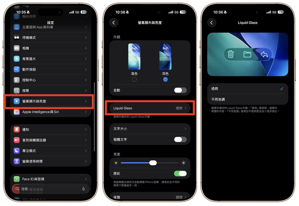 iOS 26.1 最大的介面改動是新增「Liquid Glass」選項,用戶可在「設定」、「螢幕顯示與亮度」、「Liquid Glass」中自由選擇「透明」或「不同色調」模式。