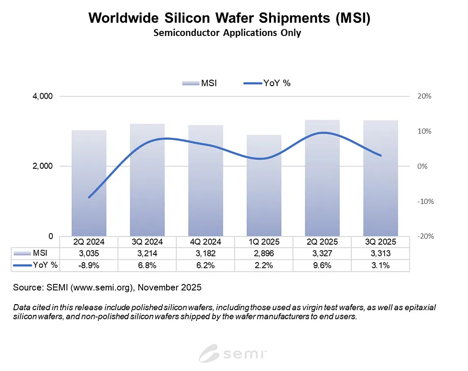 SEMI先前預期,2025年半導體矽晶圓總出貨量可望增加5.4%,至128.24億平方英吋,主要得益於AI相關的先進邏輯及高頻寬記憶體(HBM)需求強勁成長。