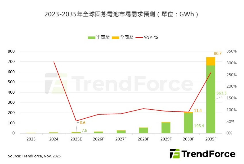 在電動車、固定式儲能、消費性電子、人型機器人、eVTOL/UAM、工業用途等對高能量密度或高可靠性應用需求的推動下,TrendForce預計2030年全球固態電池(含半固態)市場需求將突破206GWh,並於2035年擴大至740GWh以上,宣告固態電池進入大規模應用階段。