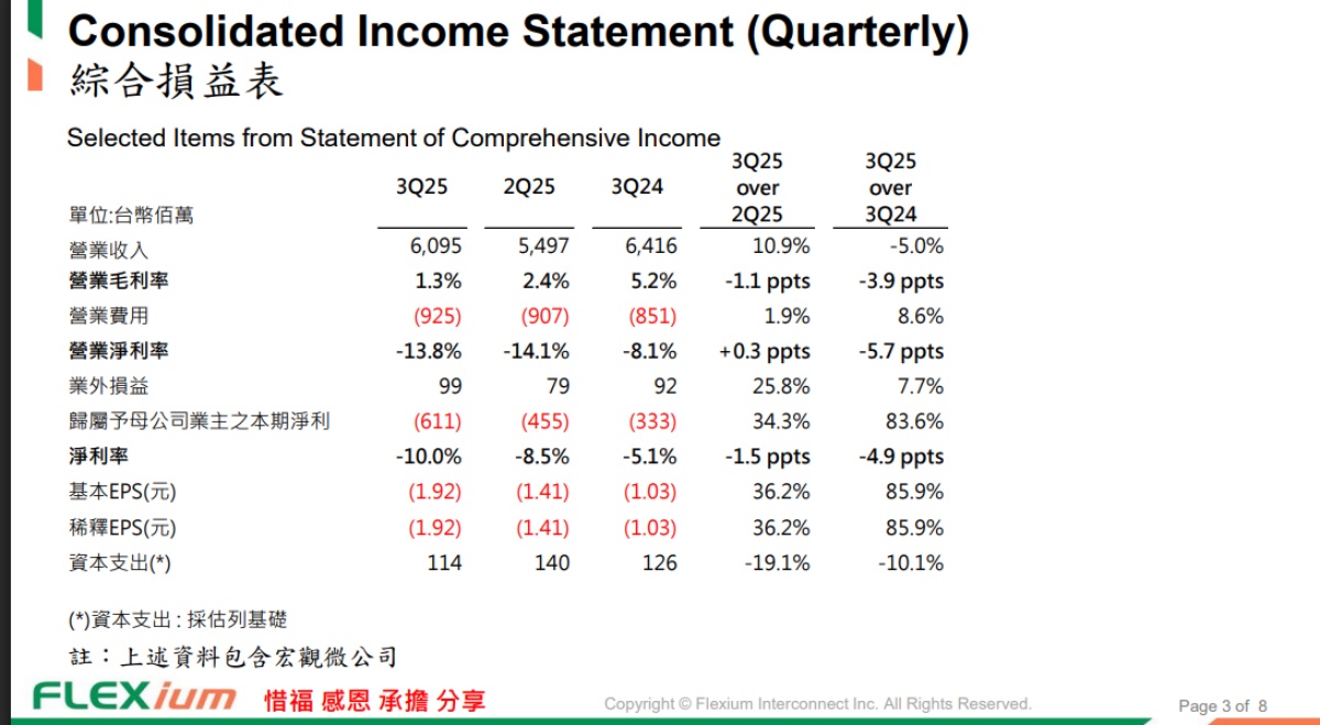 受新台幣升值與產品售價下滑影響,台郡今年前三季營收 167.64 億元,年減近兩成,稅後淨損 16.34億元,每股虧損達 5.09 元,虧損幅度為去年同期近七倍。第三季營收 60.95 億元,季增 10.9%、年減 5%,毛利率僅 1.3%,稅後淨損 6.11 億元、每股虧損 1.92 元,已連續五季虧損。熊雅士坦言,目前是轉型過程的「陣痛期」,但公司各項開發案進展順利,營運底部已現,2026 年起有望逐季改善。