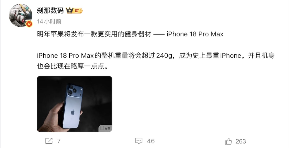 另一方面,「剎那數碼」也在另一則貼文中指出,iPhone 18 Pro Max 預計整體重量將會超過 240 克,並笑稱此一機款將會成為「更實用的健身器材」。做為比較,今年推出的 iPhone 17 Pro Max 重量為 231 克。