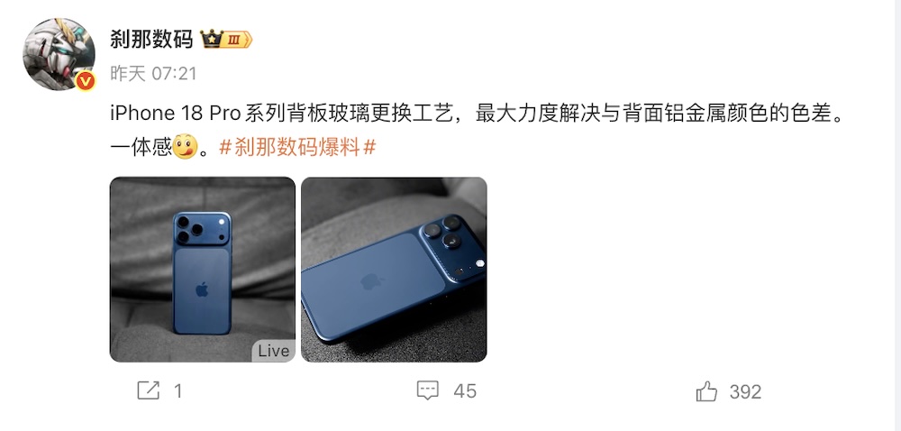 今年蘋果替 iPhone 17 Pro 系列帶來全新外觀設計,但反應不一,不少用戶認為機身背板與金屬邊框色差明顯,破壞了整體一致性。據微博博主「剎那數碼」最新爆料,蘋果正著手在明年的 iPhone 18 Pro 上調整設計,試圖讓玻璃背板與鋁合金中框之間的色調更為接近,以呈現更平滑、一體化的視覺效果。