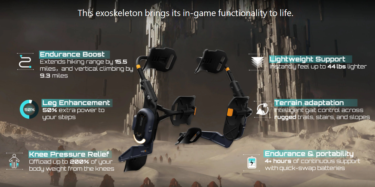 這款外骨骼除了從〈死亡擱淺 2〉世界汲取設計靈感,也提供極佳的穿著舒適性和持久舒適感。就跟遊戲中一樣,其配置的指示燈可以讓使用者查看電池電量,也可以顯示運作狀態。每台裝置均刻有唯一序號,突顯限量版身份。摺疊後尺寸與 iPad mini 相當,方便攜帶。裝置適用於日常、騎乘、健行、滑雪、水上訓練等多種場景。