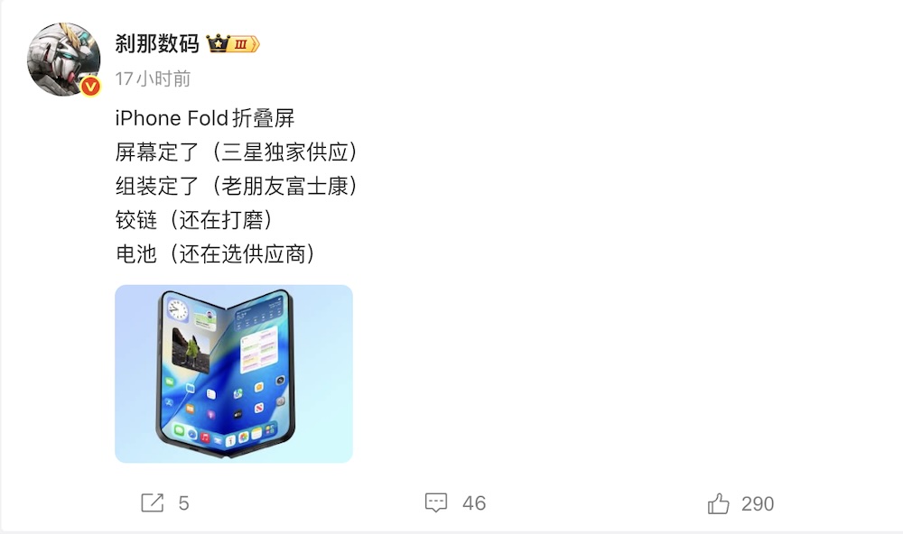 只不過摺疊 iPhone 可能不會在短期內量產。據微博博主「剎那數碼」爆料指稱,iPhone Fold 的螢幕可能已經定案,但鉸鏈與電池仍不在此進度範圍內。據多項報導,鉸鏈機構一直是讓蘋果最頭痛的部分,傳聞該機構採用液態金屬材料,據稱能提升抗彎摺能力。