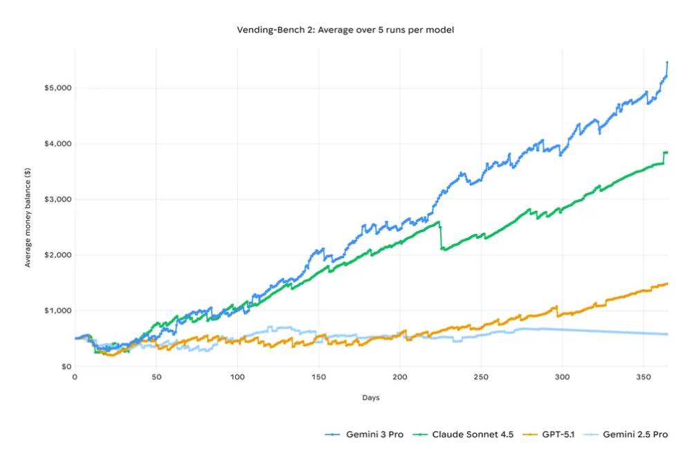 ▲ Gemini 3 Pro 展現更好的長期規劃能力,與競爭對手相比產生更高的回報。(Source:Google Blog)