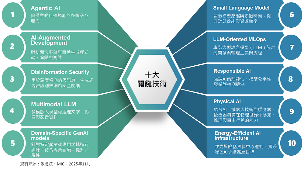 AI 正成為全球軟體發展的核心主軸,從 GenAI 的興起,擴展至結合實體互動的 Physical AI,持續全面滲透至百工百業。就技術而言,LLM 朝向長文化、領域化、多模多工、平台化、小型化及代理人化發展;在應用面,AI 加速企業流程自動化、商用 AI Agent 逐步落地、企業加速 AI 轉型。資策會發布 2026 年十大關鍵技術,包括實體 AI(Physical AI)、特定領域生成式 AI 模型(Domain-Specific GenAI)、負責任 AI(Responsible AI)等。這十大技術將重塑產業結構,帶動醫療健康、能源效率、人機協作等新應用。