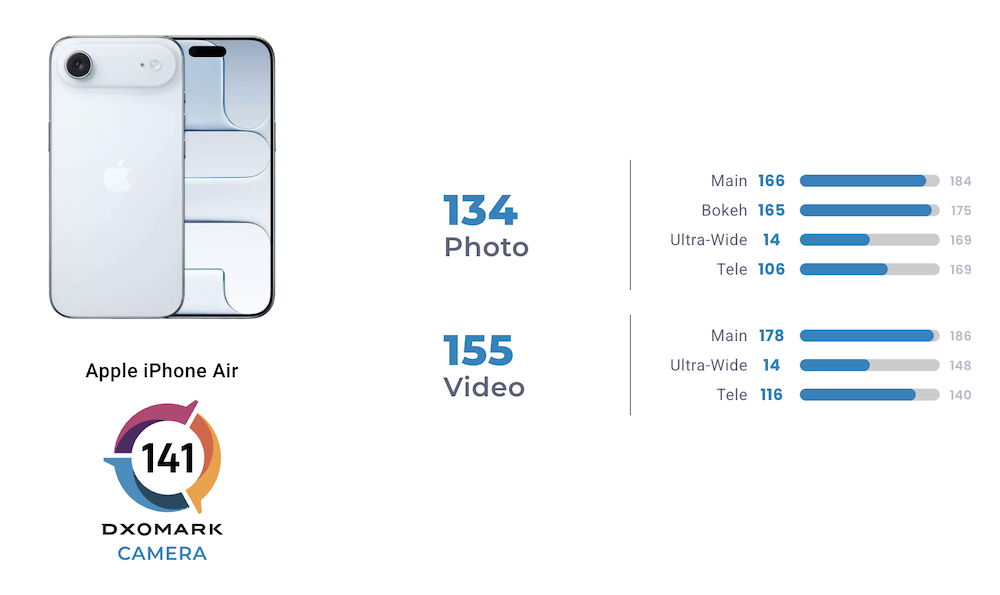 DXOMARK 給予 iPhone Air 相機 141 分,將其排在全球智慧型手機相機排行榜的第 41 名,並與 iPhone 13 Pro、iPhone 13 Pro Max 以及 Xiaomi Mi 11 Ultra 等過往旗艦同級。雖然名次不算頂尖,但在單鏡頭配置的前提下,這項成績仍具有一定代表性。