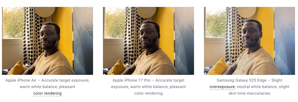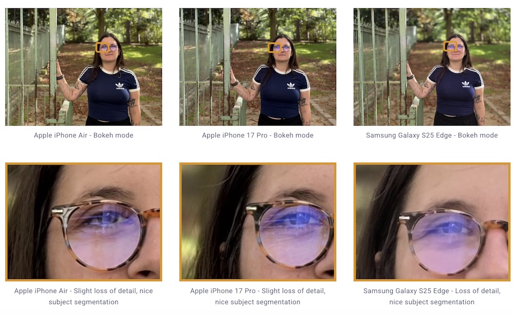 在影像細節方面,iPhone Air 在背景虛化(bokeh)與主體分離的測試項目獲得不錯評價,甚至在部分情境中比 Galaxy S25 Edge 表現更為精準,顯示蘋果在場景深度演算上依舊保持領先。