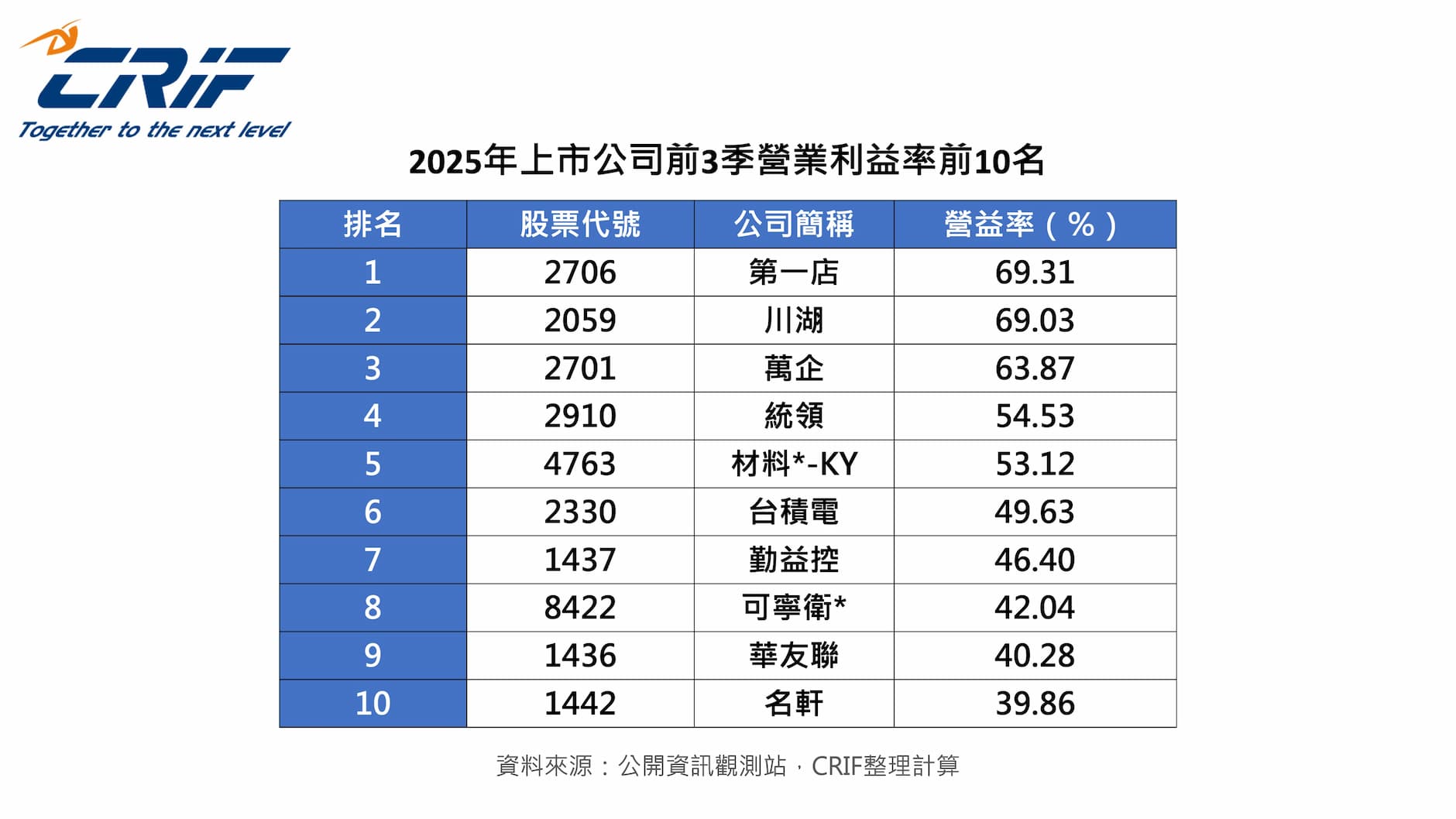 今年前三季營業利益率前十名中,第一店以 69.31% 奪榜首,川湖以 69.03% 些微之差位居第二名,萬企以 63.87% 排第三名;統領以 54.53% 列第四名;材料-KY 以 53.12% 居第五名;台積電以 49.63% 列第六名;勤益控股以 46.4% 排第七名;可寧衛以 42.04% 居第八名;華友聯以 40.28% 列第九名;名軒以 39.86% 位居第十名,整體多屬小型資產股及建設股。