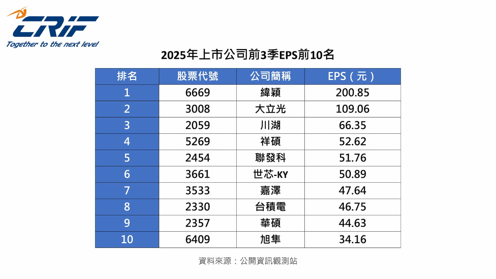 至於前三季每股盈餘(EPS)前十名由緯穎以 200.85 元摘王座,並大幅領先以 EPS 109.06 元居於第二名的大立光,而第三名至第六名 EPS 也都超過 50 元,依次為川湖的 66.35 元、祥碩的 52.62 元、聯發科的 51.76 元,以及世芯-KY 的 50.89 元。