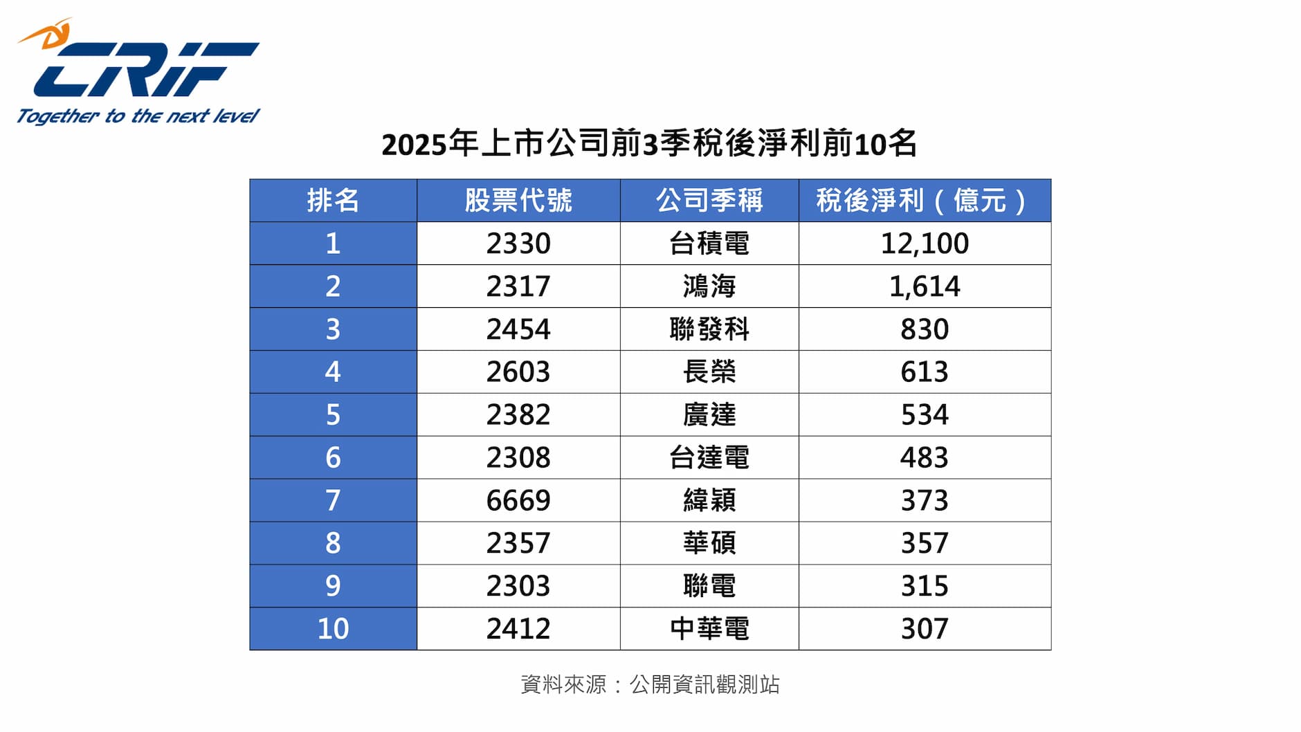第七名至第十名依次為緯穎 373 億元、華碩 357 億元、聯電 315 億元及中華電 307 億元,其中緯穎與華碩均創前三季獲利歷史新高,整體而言,前三季獲利前十大的企業中有六家締造獲利新高紀錄,全都屬 AI 相關股。