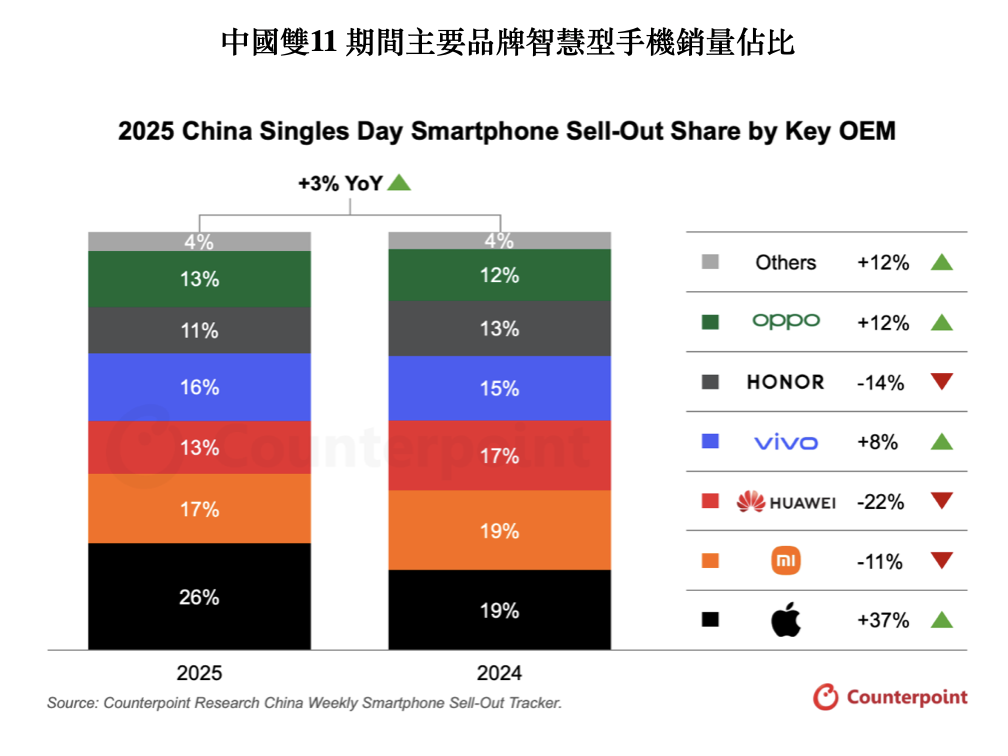 據調研機構 Counterpoint Research《中國智慧型手機周度銷售追蹤》報告顯示,2025 年中國雙十一購物期間智慧型手機銷量年增 3%,主要由 iPhone 17 系列需求推動。