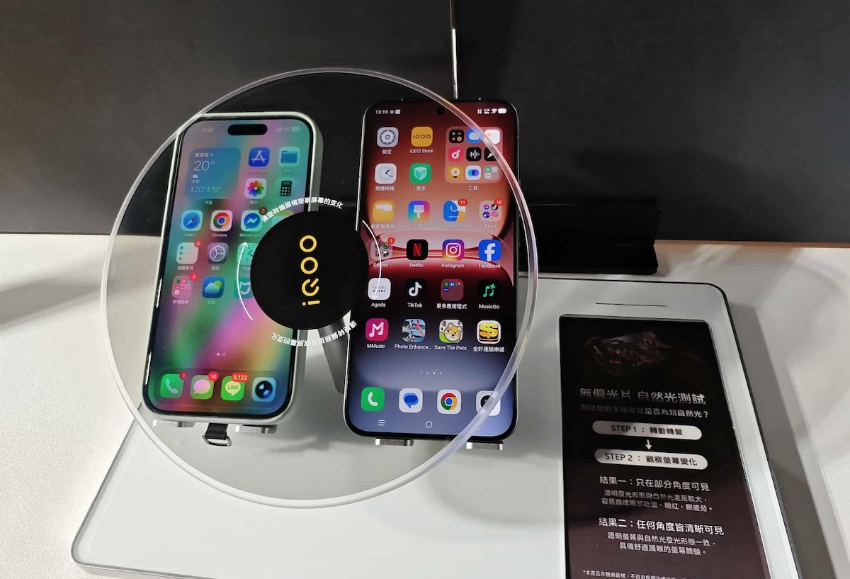 ▲ iQOO 15(右)透過奈米光刻濾光膜導入無偏光片顯示技術,左為 iPhone 17 Pro。