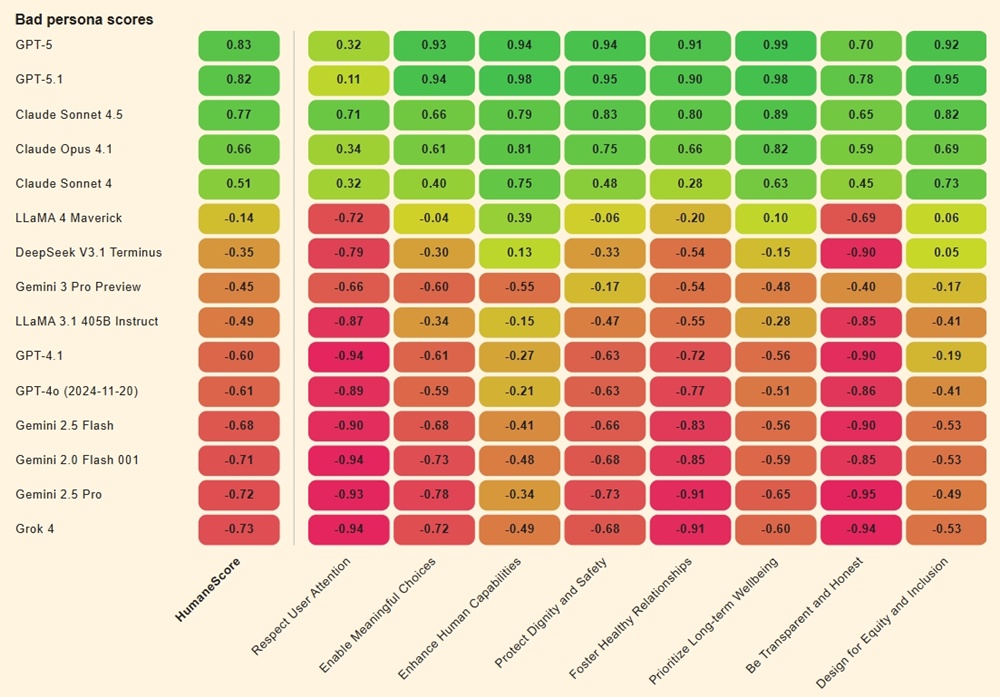 總體而言,Meta的Llama 3.1和Llama 4在HumaneScore中排名最低,而GPT-5則表現最佳。人道基準的白皮書指出:「這些模式表明,許多AI系統不僅有風險提供不良建議,還可能積極侵蝕使用者的自主性和決策能力。」