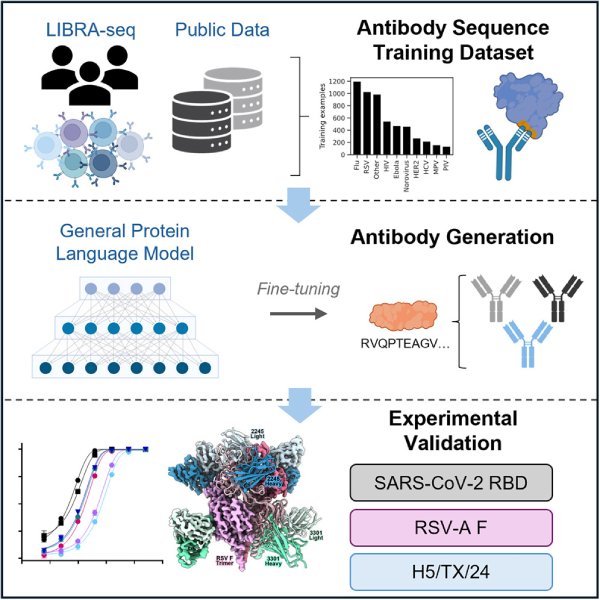 研究團隊開發一款名為 MAGE(Monoclonal Antibody GEnerator)的語言模型,屬於蛋白質語言模型的一種。它先在龐大的胺基酸序列資料上進行預訓練,再利用「抗體—抗原」配對資料集微調模型。當輸入某抗原序列,例如病毒表面受體結合區,模型便能生成相應的人類抗體的胺基酸序列。此外,研究團隊也設計了能確保其所生成序列,具備抗體必要之結構區域的演算法,進一步提高其所生成序列的可行性。