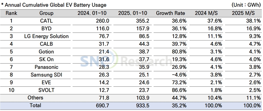 其中,從LG化學(LG Chem)分拆出來的電池事業LG能源解決方案,2025年前十月的電池使用量為86.5GWh,較去年同期成長12.8%,排名維持全球第三。
