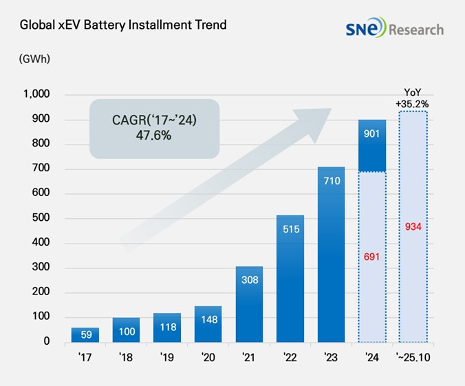 韓媒《BusinessKorea》報導,根據韓國研調機構SNE Research最新報告,2025年前十月,全球純電車(EV)、插電式油電混合車(PHEV)和油電混合車(HEV)的電池使用量達933.5GWh,較2024年同期激增35.2%,顯示市場需求持續快速成長。