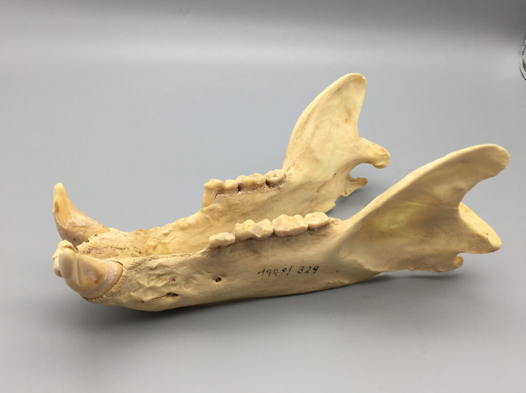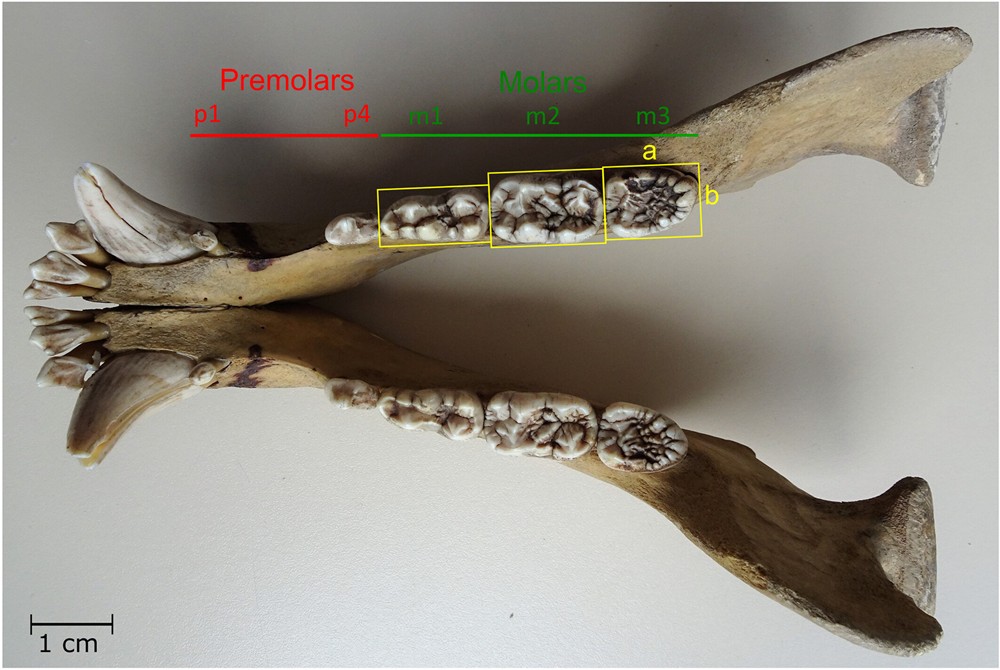 ▲ 棕熊下顎骨咬合面視圖。圖中顯示前臼齒 p1 和 p4,以及依次排列的臼齒 m1 至 m3。(Source:Boreas