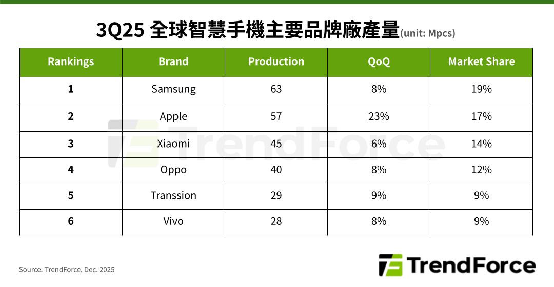 Apple第三季手機產量約為5,700萬支,創歷年第三季最高,居第二名。其iPhone 17基本款「價格持平、容量升級」的策略成功,Pro系列外觀辨識度升級亦有助拉貨。Xiaomi(含Redmi、POCO)下半年藉新機發表、節慶備貨激勵出貨動能,第三季產量近4,500萬支,季增約6%,位居第三。