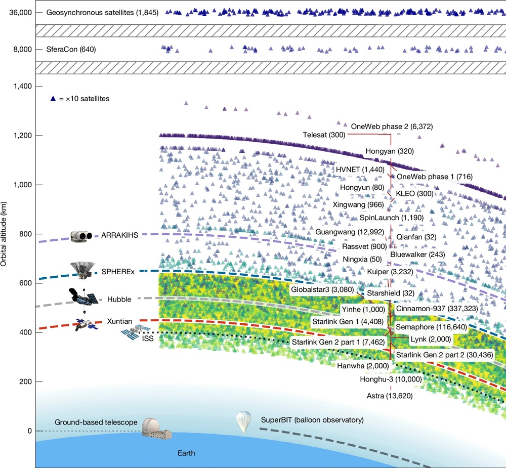 ▲ 此圖將衛星的高度與哈伯太空望遠鏡、巡天太空望遠鏡(中國太空站望遠鏡)、SPHEREx 以及研議中的 ARRAKIHS 任務的軌道進行比較。衛星星座的標籤顯示了計畫中的衛星數量。每個符號代表 10 顆衛星。